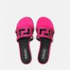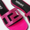 Con un acabado satinado, estas sandalias planas con punta abierta presentan un patrón de greca calado adornado con cristales en la tira delantera en un distintivo diseño de laberinto.