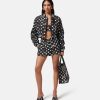Estos pantalones cortos de sarga de seda con lunares tienen un diseño inspirado en la ropa de estar por casa con una tapeta con botones ocultos y motivos de mariposas y mariquitas. dua lipa x versace es una cápsula de estilos diseñados en colaboración con dua lipa y presentados en la pasarela de cannes.