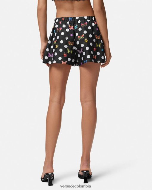 Estos pantalones cortos de sarga de seda con lunares tienen un diseño inspirado en la ropa de estar por casa con una tapeta con botones ocultos y motivos de mariposas y mariquitas. dua lipa x versace es una cápsula de estilos diseñados en colaboración con dua lipa y presentados en la pasarela de cannes.