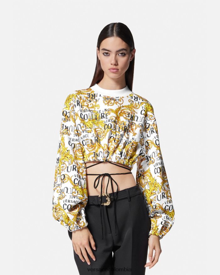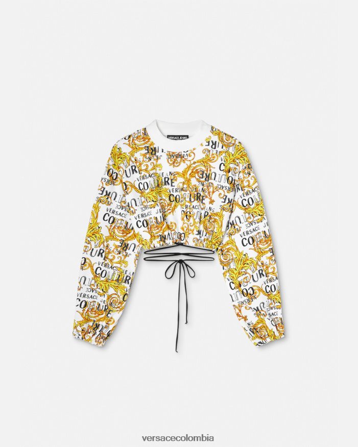 Esta sudadera corta de algodón presenta un estampado de logotipo de alta costura con un cordón envolvente que se anuda en la cintura.