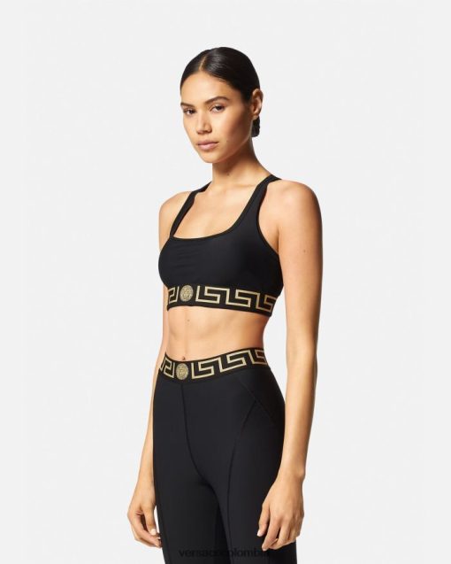 Este sujetador deportivo con cuello redondo y espalda nadadora presenta el característico borde de Greca en la cinturilla elástica.