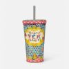un vaso de viaje de acero inoxidable adornado con cristales y pajita para bebidas frías con motivos de medusa y logotipos.