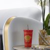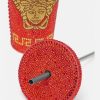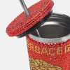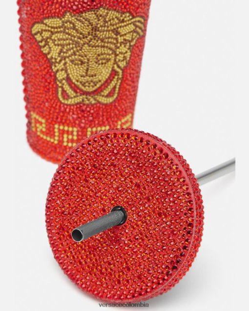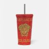 un vaso de viaje de acero inoxidable adornado con cristales y pajita para bebidas frías con motivos de medusa y logotipos.