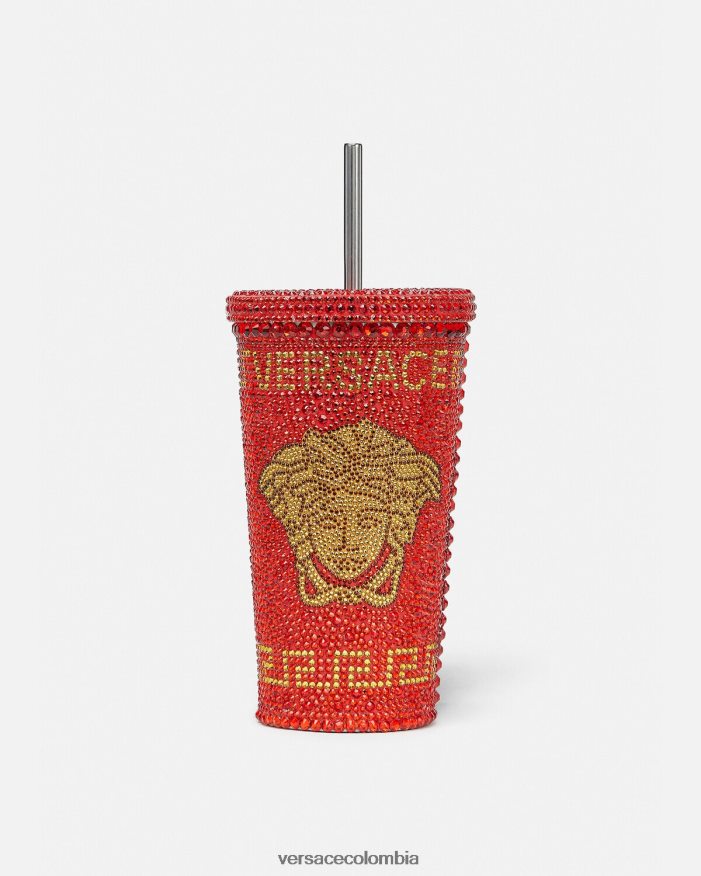 un vaso de viaje de acero inoxidable adornado con cristales y pajita para bebidas frías con motivos de medusa y logotipos.