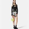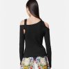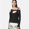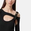 Este top acanalado de manga larga presenta detalles recortados, un diseño con hombros descubiertos y una hebilla barroca decorativa en la correa para el hombro.