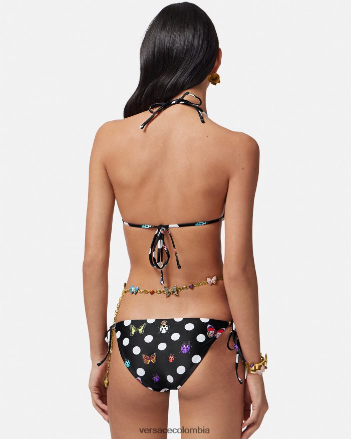 versace presenta dua lipa x versace, una colección cápsula codiseñada con dua lipa. Este top de bikini triangular de lunares presenta un estampado de mariposas y mariquitas con detalles metálicos de medusa. Este diseño de ropa de playa se puede combinar con una braguita de bikini con el estampado a juego.