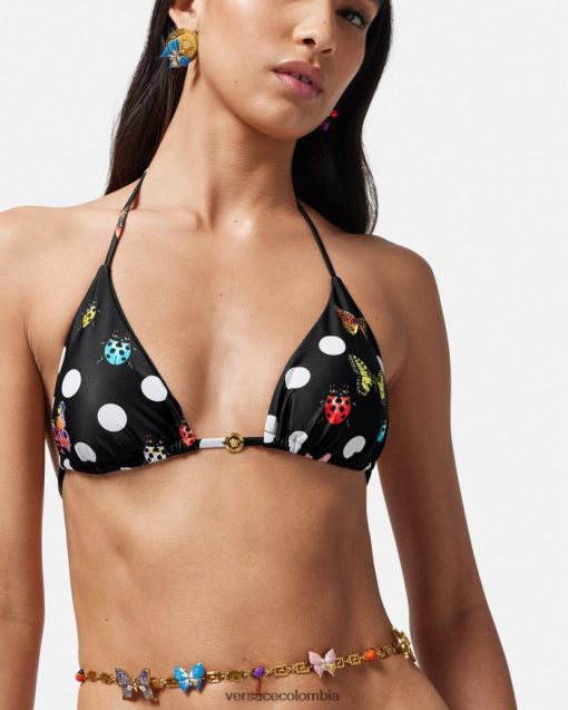 versace presenta dua lipa x versace, una colección cápsula codiseñada con dua lipa. Este top de bikini triangular de lunares presenta un estampado de mariposas y mariquitas con detalles metálicos de medusa. Este diseño de ropa de playa se puede combinar con una braguita de bikini con el estampado a juego.