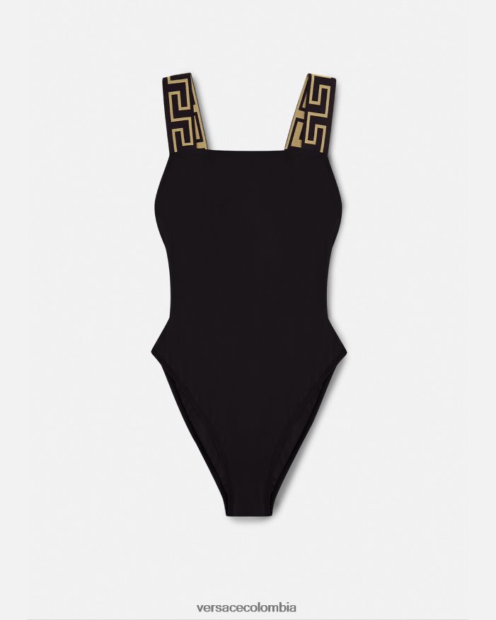Este traje de baño de una pieza tiene escote cuadrado, espalda escotada y presenta el característico borde de greca y medusa en los tirantes.