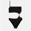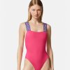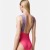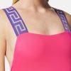 Este traje de baño de una pieza tiene escote cuadrado, espalda escotada y presenta el característico borde de greca y medusa en los tirantes.