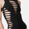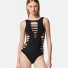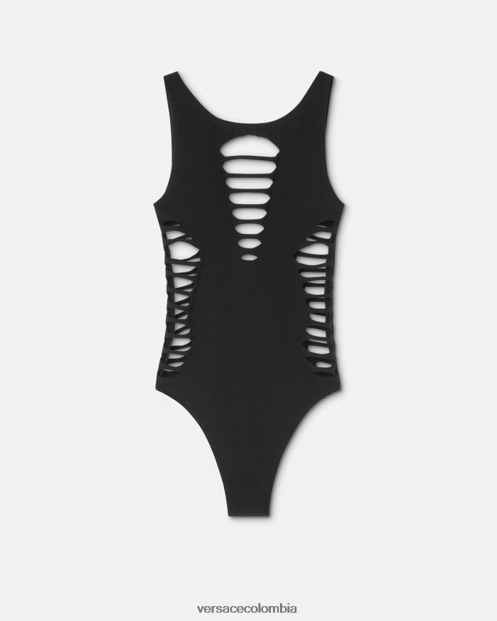un traje de baño de una pieza con aberturas por todas partes y una sutil tachuela de medusa en la espalda.