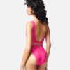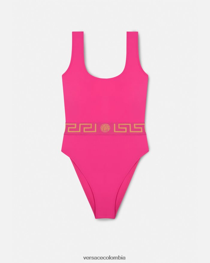 Este traje de baño de una pieza presenta detalles de greca en la cintura y un motivo de medusa central.