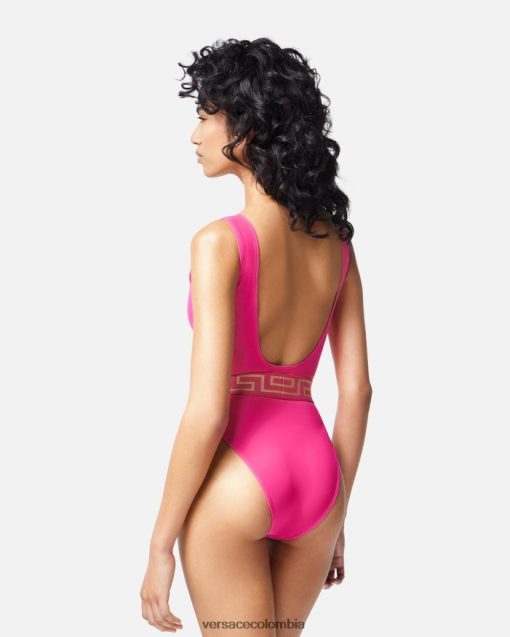 Este traje de baño de una pieza presenta detalles de greca en la cintura y un motivo de medusa central.