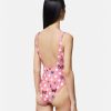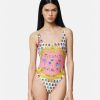 Este traje de baño de una pieza presenta el estampado tradicional de mariposas y mariquitas, y tiene escote cuadrado y espalda escotada.