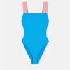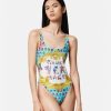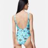 Este traje de baño de una pieza presenta el estampado tradicional de mariposas y mariquitas, y tiene escote cuadrado y espalda escotada.