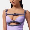 versace presenta dua lipa x versace, una colección cápsula codiseñada con dua lipa. Este minivestido recortado tiene una silueta ajustada con ribetes adornados con cristales y cierres de hebilla.