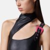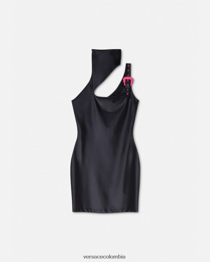 Este minivestido asimétrico sin cordones tiene cuello alto y hebilla barroca en contraste.