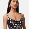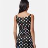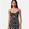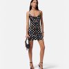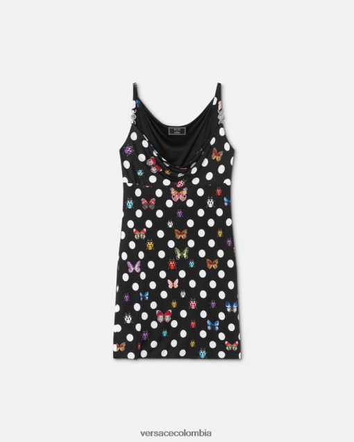 un minivestido de lunares con estampado de mariposas y mariquitas, un patrón de archivo renovado de los años 90 y piezas metálicas de medusa del 95 en los tirantes. Este artículo forma parte de la colección cápsula codiseñada con Dua Lipa.
