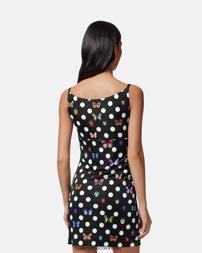 un minivestido de lunares con estampado de mariposas y mariquitas, un patrón de archivo renovado de los años 90 y piezas metálicas de medusa del 95 en los tirantes. Este artículo forma parte de la colección cápsula codiseñada con Dua Lipa.