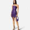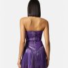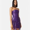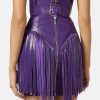 un minivestido sin mangas confeccionado íntegramente en piel flexible y con detalles de flecos en los laterales y en la espalda.
