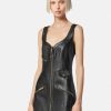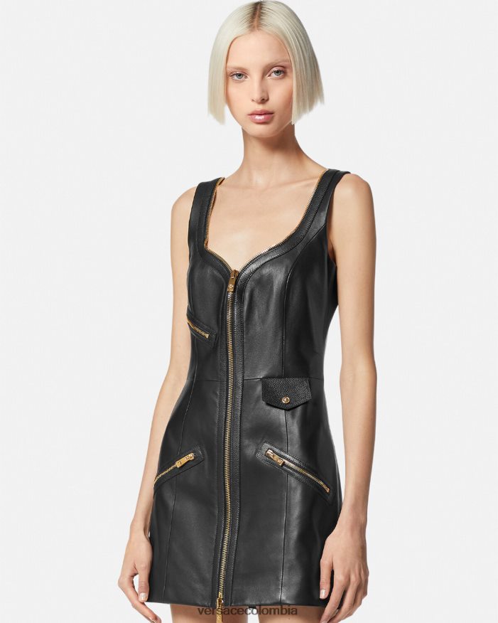 Este minivestido sin mangas, confeccionado íntegramente en cuero liso, presenta un escote en forma de corazón con cremallera y bolsillos decorativos con cremallera para lograr un estilo Versace inspirado en los moteros. La pieza está completamente forrada con un estampado de La Greca tonal.