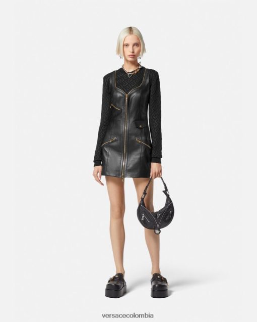 Este minivestido sin mangas, confeccionado íntegramente en cuero liso, presenta un escote en forma de corazón con cremallera y bolsillos decorativos con cremallera para lograr un estilo Versace inspirado en los moteros. La pieza está completamente forrada con un estampado de La Greca tonal.
