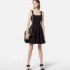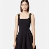 un vestido plisado con cuello cuadrado y remates de hebilla de alta costura barroca en los tirantes.