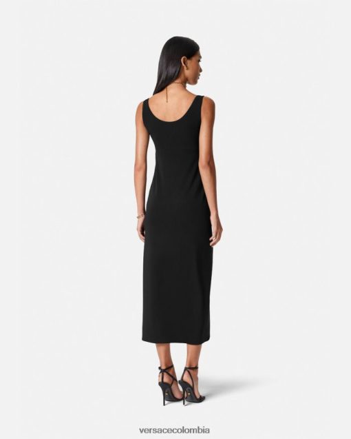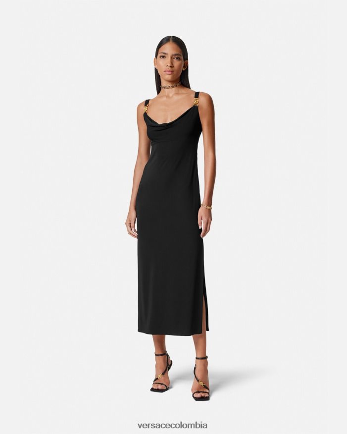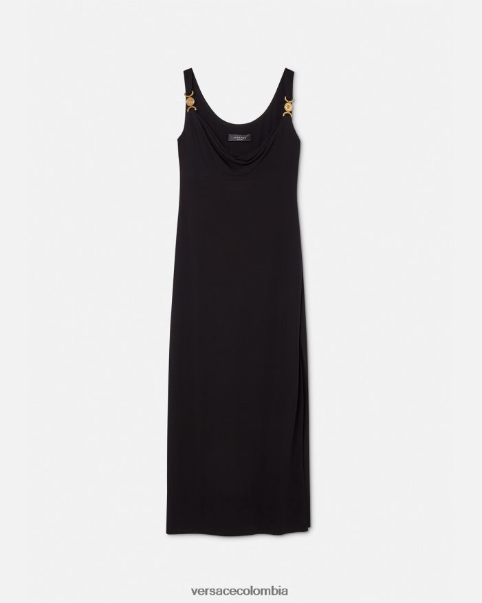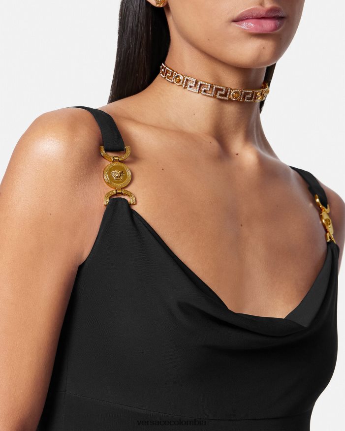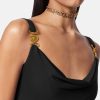 versace presenta dua lipa x versace, una colección cápsula codiseñada con dua lipa. Confeccionado con una silueta ajustada, este vestido de crepé tiene un diseño sin mangas con detalles metálicos de Medusa ’95 en los tirantes de los hombros. El estilo de noche se detalla con un escote redondo drapeado.
