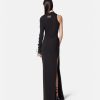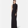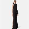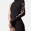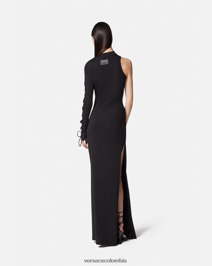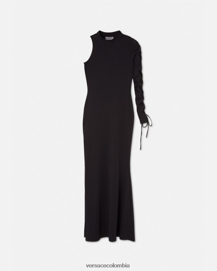 Un vestido largo de punto elástico con diseño de un solo hombro y detalle de cordones en la manga.