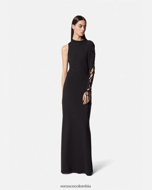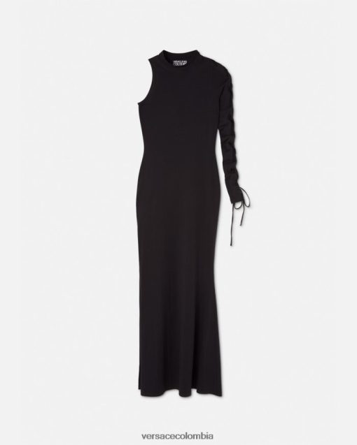 Un vestido largo de punto elástico con diseño de un solo hombro y detalle de cordones en la manga.