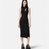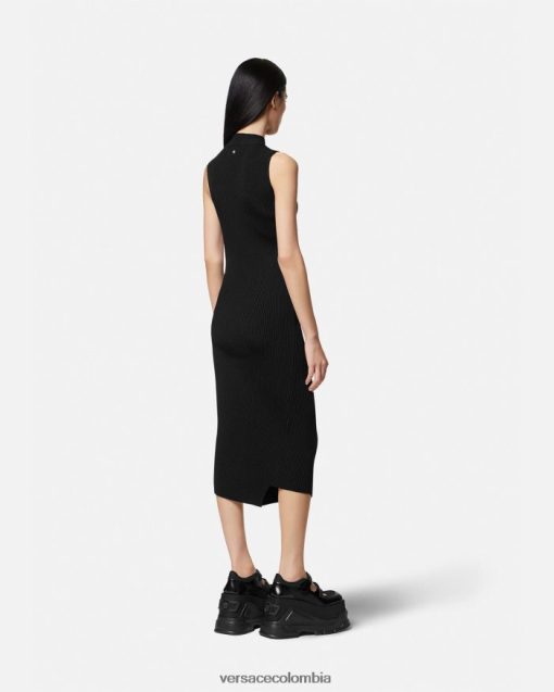 un vestido midi sin mangas y asimétrico con cuello alto acanalado, abertura frontal, costuras torcidas diagonales y una pequeña tachuela de medusa en la parte posterior.