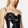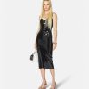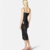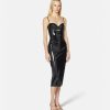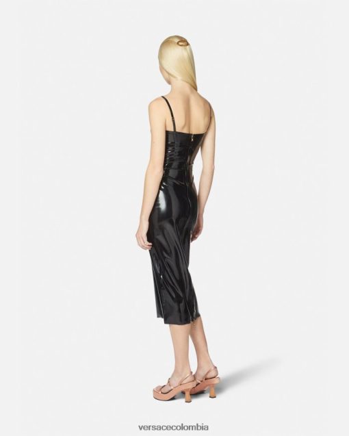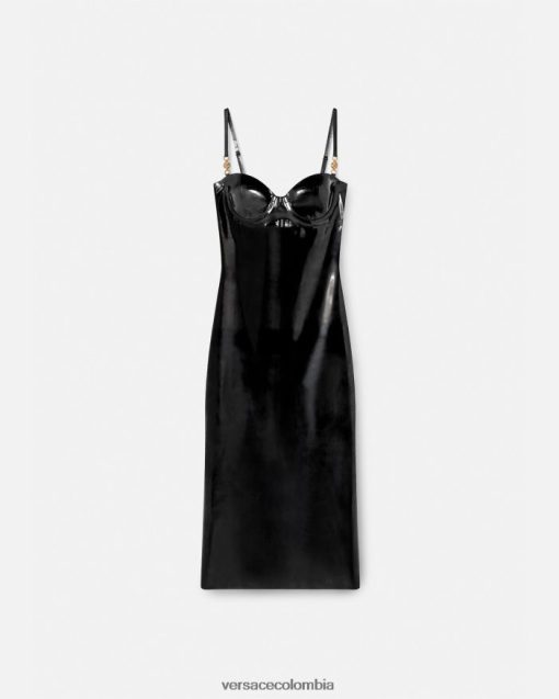 Un diseño por excelencia de Versace, este vestido midi de látex presenta un escote corpiño con abertura en forma de cerradura, acentuado con piezas metálicas doradas de medusa en la cremallera y tirantes finos.