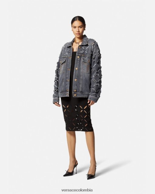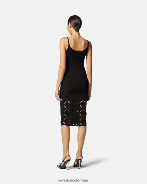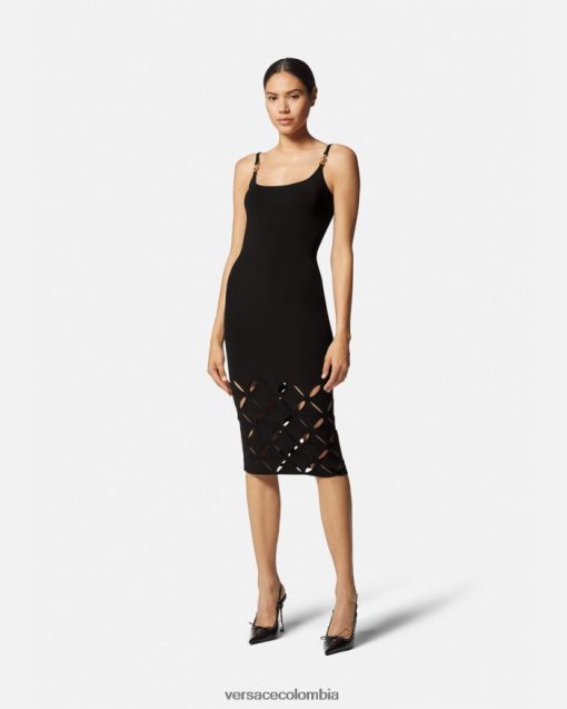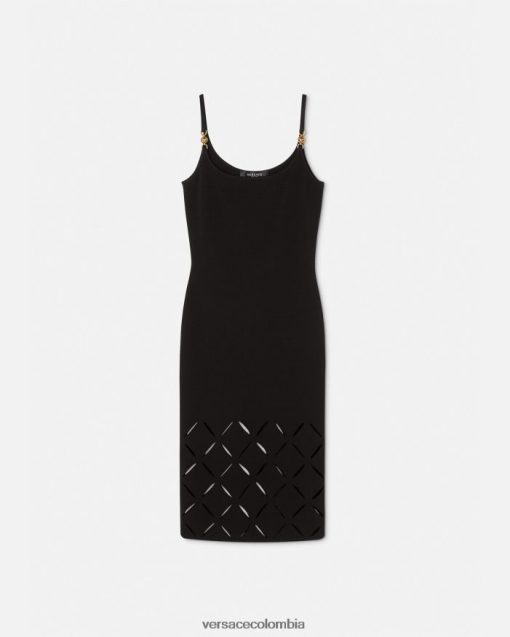Con un corte entallado, este vestido midi sin mangas está confeccionado en punto acanalado con cortes de diamantes en el dobladillo y está realzado con piezas metálicas de Medusa en los tirantes.