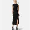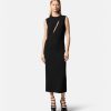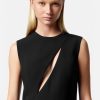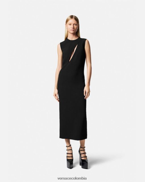 un vestido recto sin mangas con una llamativa abertura en el pecho y la espalda, completo con una abertura lateral.