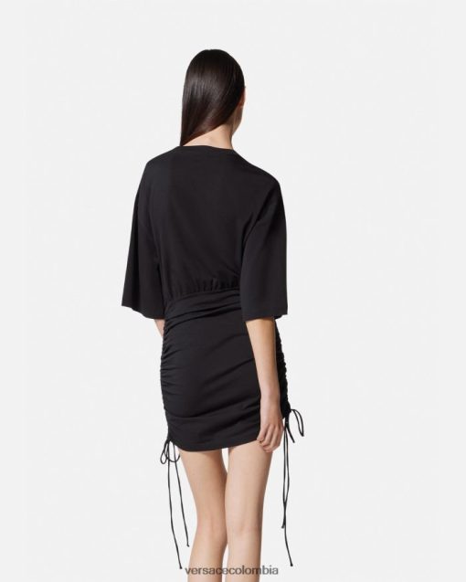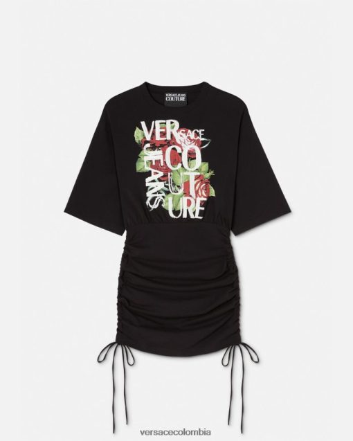 Este vestido camisero de punto con cordones tiene mangas cortas y presenta un estampado de rosas con un logo texturizado con efecto de pintura tridimensional.