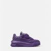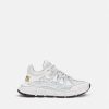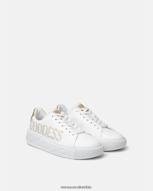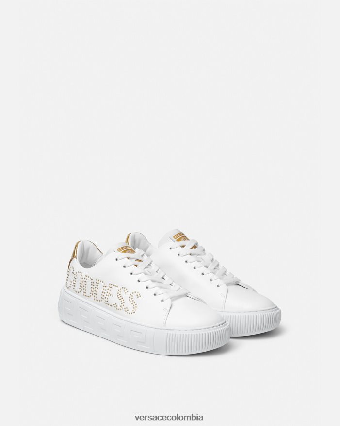 La silueta de caña baja se caracteriza por un patrón de greca grabado sobre suelas de goma vulcanizada, con las palabras “versace” y “diosa” tachonadas en los laterales. un sello con el logotipo en la parte trasera acentúa el estilo con cordones.