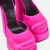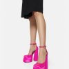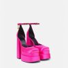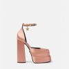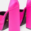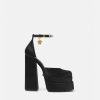 Estos zapatos de tacón de satén, un diseño llamativo de pasarela, cuentan con un tacón alto en bloque y una plataforma doble. la correa del tobillo está adornada con pedrería y un dije de medusa característico.