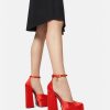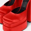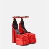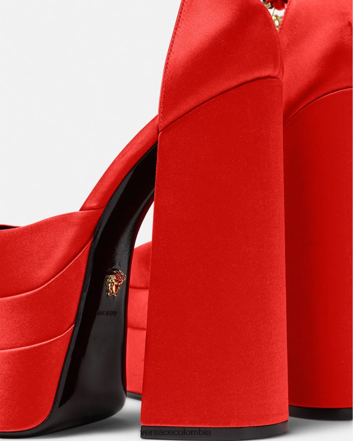 Estos zapatos de tacón de satén, un diseño llamativo de pasarela, cuentan con un tacón alto en bloque y una plataforma doble. la correa del tobillo está adornada con pedrería y un dije de medusa característico.
