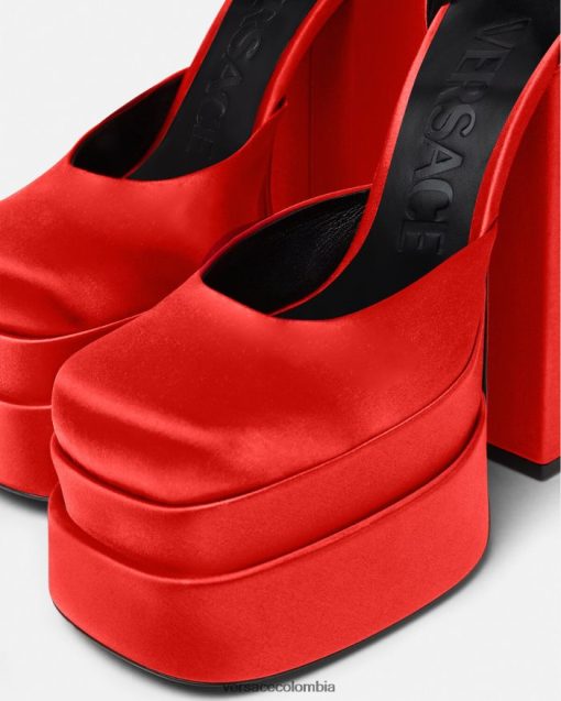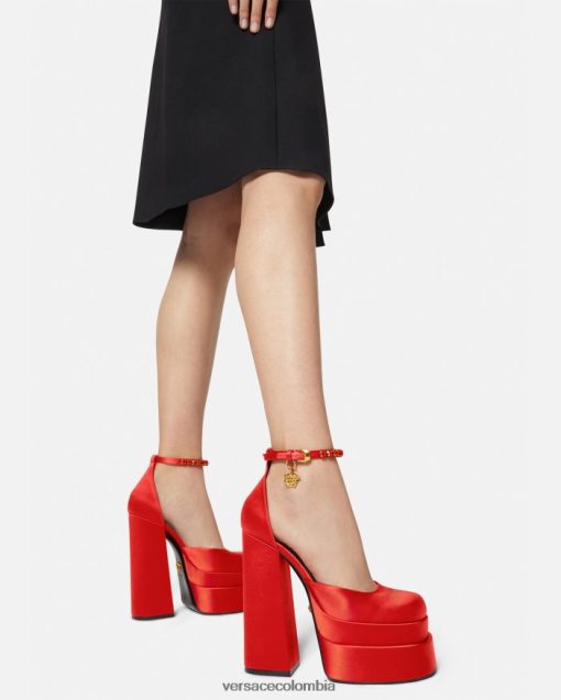 Estos zapatos de tacón de satén, un diseño llamativo de pasarela, cuentan con un tacón alto en bloque y una plataforma doble. la correa del tobillo está adornada con pedrería y un dije de medusa característico.