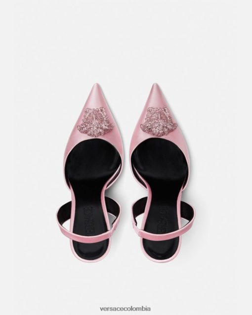 Estos zapatos destalonados, elegantes y sin esfuerzo, están confeccionados en satén suave. la elegante silueta de punta puntiaguda está adornada con una placa de medusa con incrustaciones de cristales, la decoración icónica que se encuentra en las puertas de la primera sede de la marca en Milán.