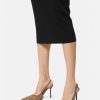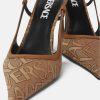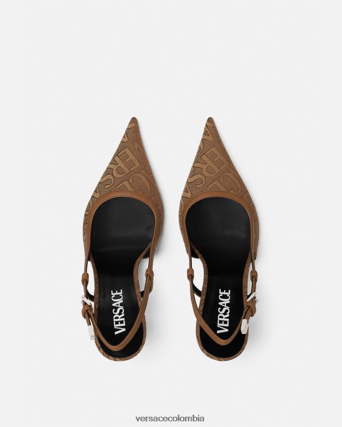 Estos zapatos de tacón con tira trasera están confeccionados en lona jacquard de Versace con adornos de cuero, con un diseño de tacón alto y puntera en punta.