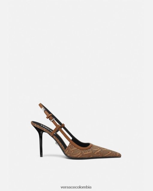 Estos zapatos de tacón con tira trasera están confeccionados en lona jacquard de Versace con adornos de cuero, con un diseño de tacón alto y puntera en punta.