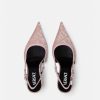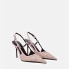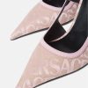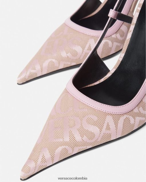 Estos zapatos de tacón con tira trasera están confeccionados en lona jacquard de Versace con adornos de cuero, con un diseño de tacón alto y puntera en punta.