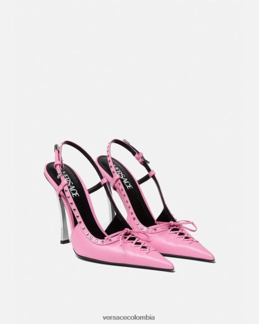 Estos zapatos de tacón de cuero con tira trasera se caracterizan por tener tacones de aguja altos y curvos. Con puntera puntiaguda, están acentuados por tachuelas y detalles de cordones en la parte superior.