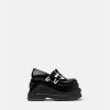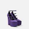 Estos llamativos zapatos de tacón en punta de Versace se definen por un tacón de plataforma con muescas en forma de onda. Los herrajes en forma de V en las correas de las hebillas acentúan la parte superior de satén.