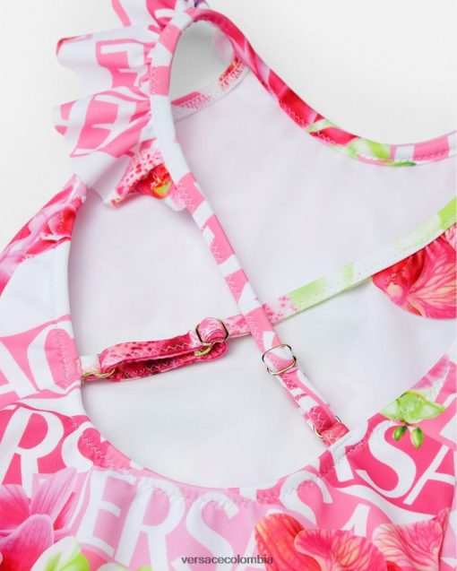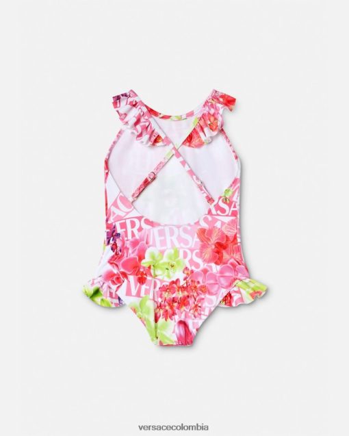 un precioso diseño de trajes de baño para días divertidos en la piscina o la playa, con un estampado de orquídeas para niños con el logotipo de Versace y ribetes con volantes.