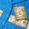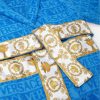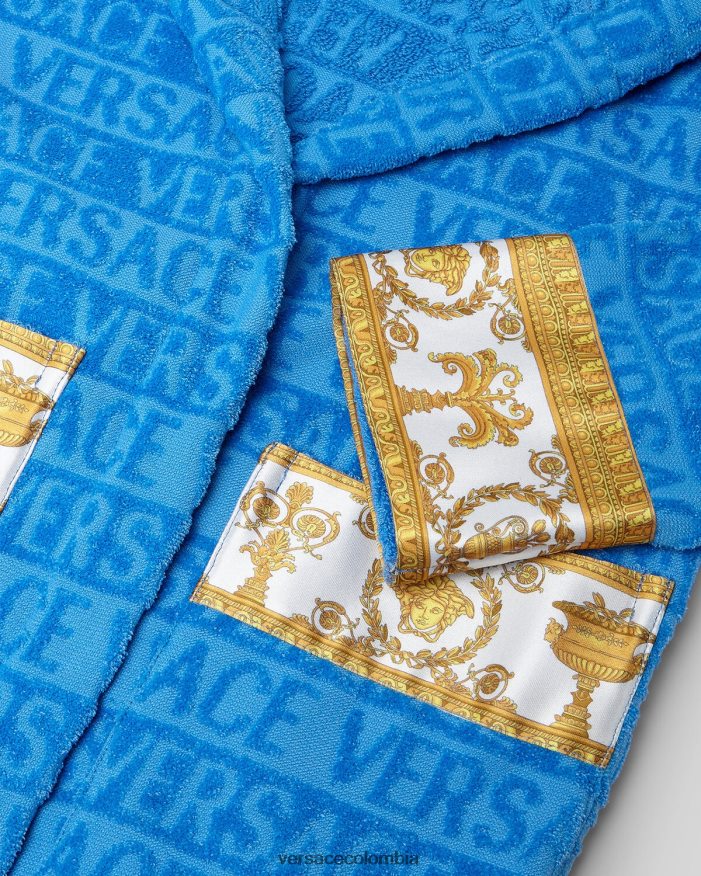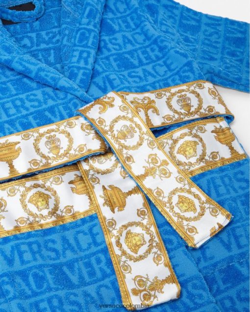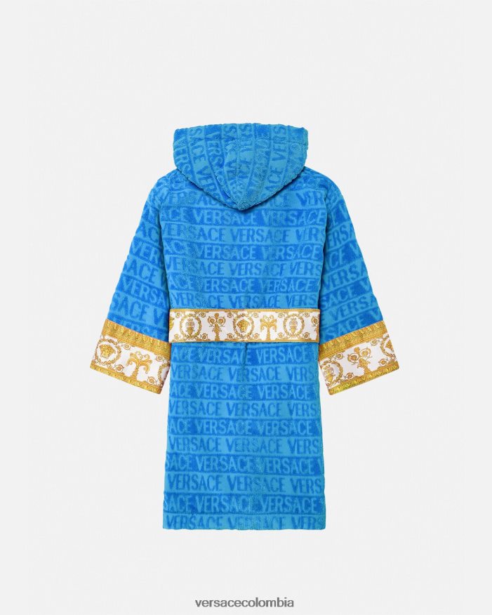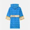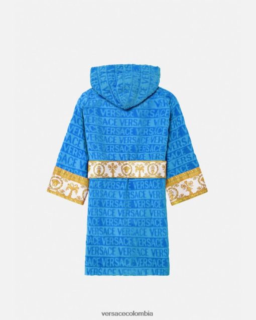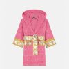 Este albornoz de felpa con capucha para los más pequeños presenta un motivo tonal de Versace en toda la prenda con mangas con estampado barroco en contraste y cinturón cruzado.