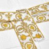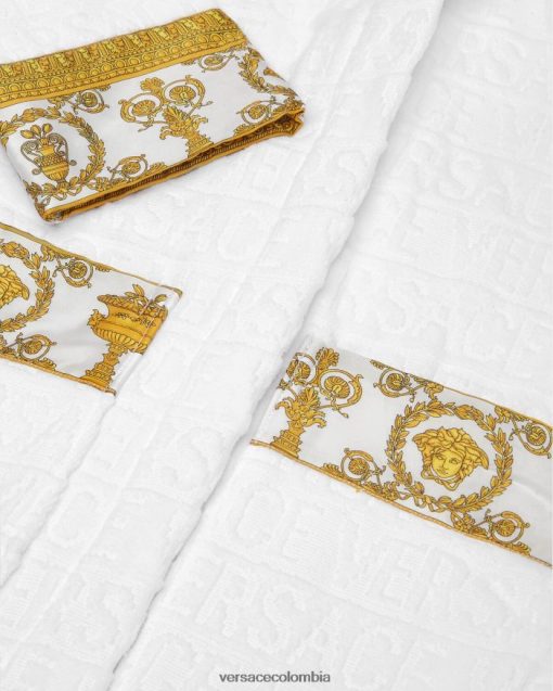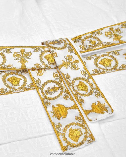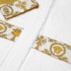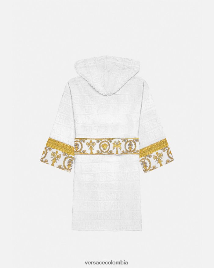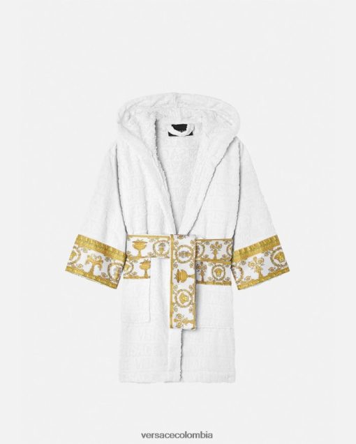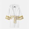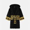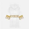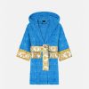 Este albornoz de felpa con capucha para los más pequeños presenta un motivo tonal de Versace en toda la prenda con mangas con estampado barroco en contraste y cinturón cruzado.