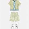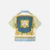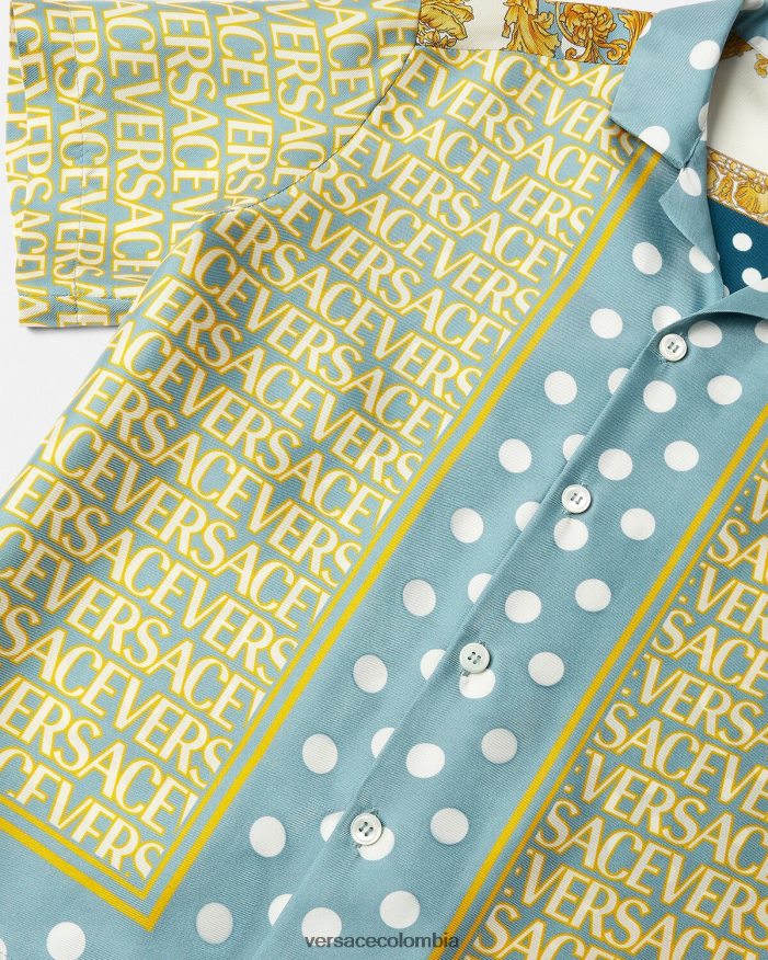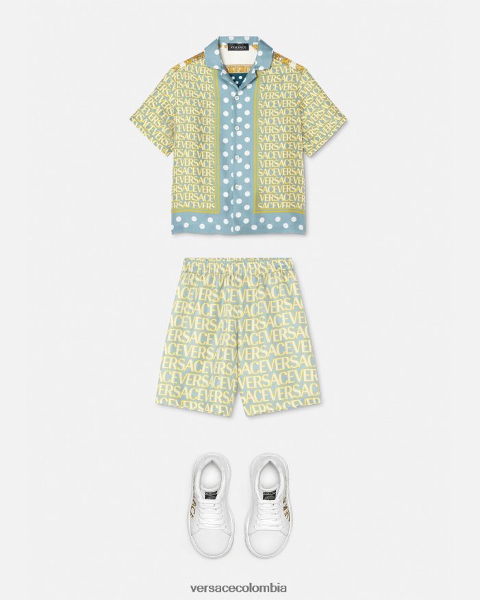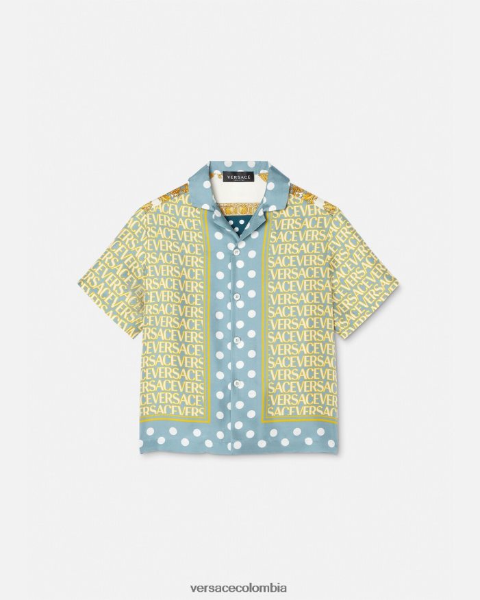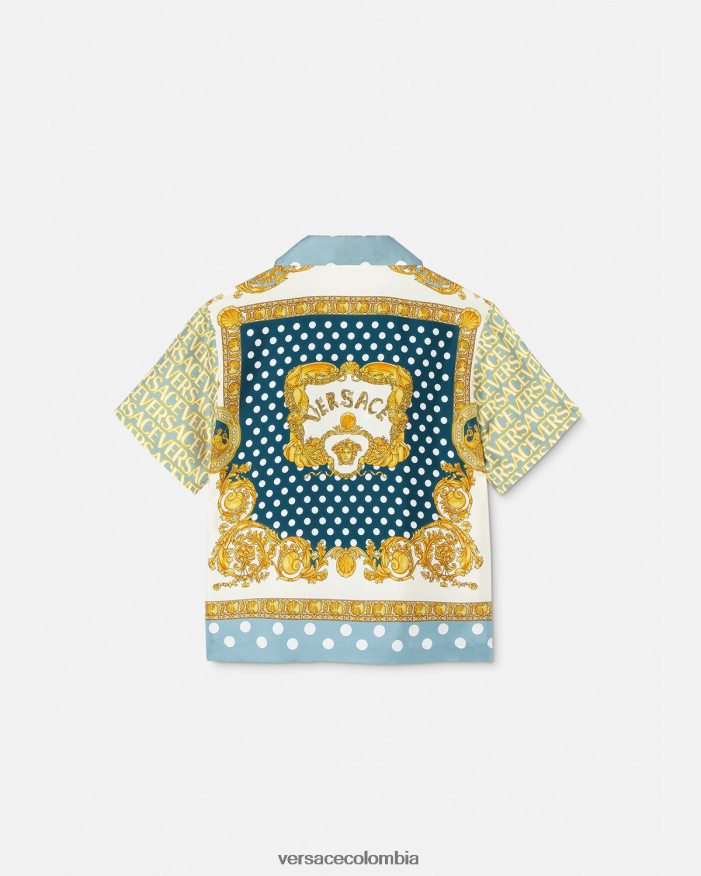 Esta camisa de sarga de seda de manga corta presenta un diseño de paneles con un estampado infantil de lunares de Versace en la parte delantera y un estampado infantil barroco de conchas marinas en la parte posterior.