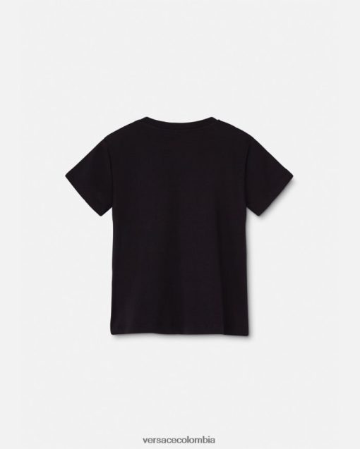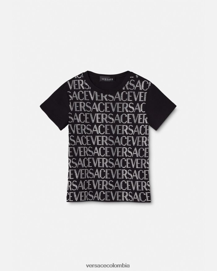 Confeccionada en algodón elástico, esta camiseta de manga corta presenta un estampado del logo infantil de Versace en toda la prenda enriquecido con adornos de cristal.