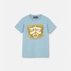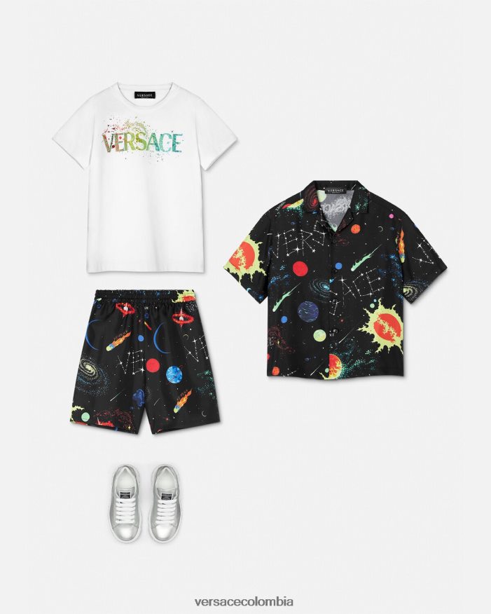 Esta camiseta de punto de algodón suave presenta un motivo infantil con el logo de Versace con elementos galácticos en un acabado metálico.
